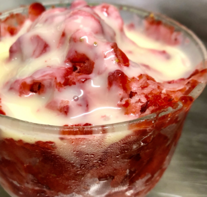 凍った苺の果肉だけを専用のフルーツカッターで削りたっぷりと練乳を掛けています